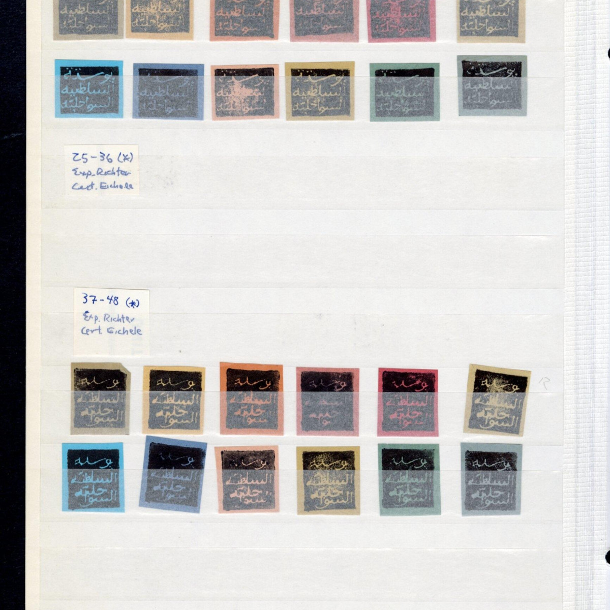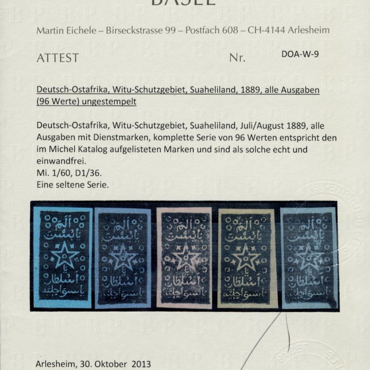 | Zusatzinformationen und Suchstichworte: | Cherrystone - Briefmarken und Postgeschichte USA und Weltweit 24. - 25. März 2026 Los 437 Deutsche Kolonien Witu Schutzgebiet GERMAN COLONIES Witu Protectorate (Mi.1-60,D1-36) 1889 Issues complete, Postage and Postage Dues, complete set of 96 different, unused without gum as issued, many signed Richter, with 2013 Eichele certificate. A rare complete set (Euro 11,410) Zuschlag 4.750,00 USD |
